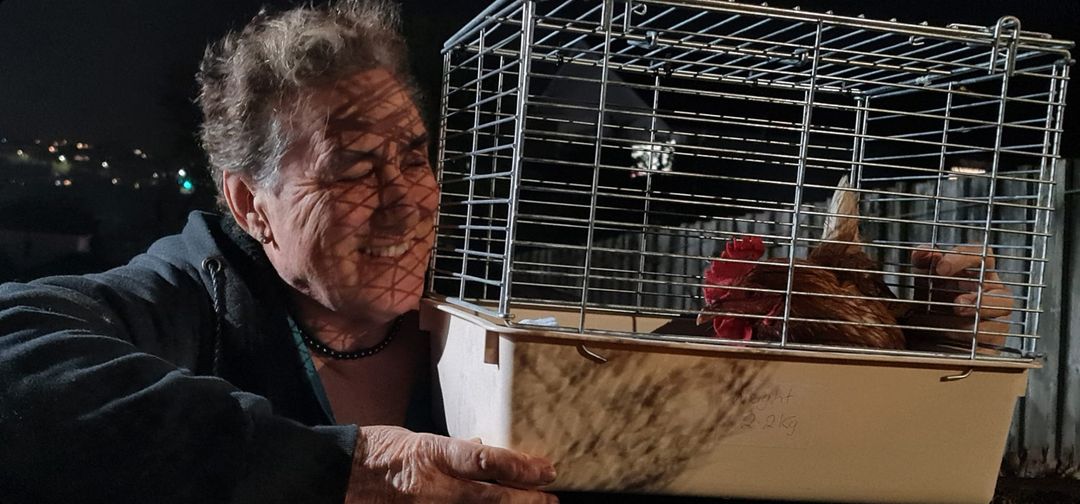 Following our advice, Kyle was delighted to be able hand catch this sweet hen and he named her Henny Penny. We collected the hungry wee girl from him and are now searching for her guardians.